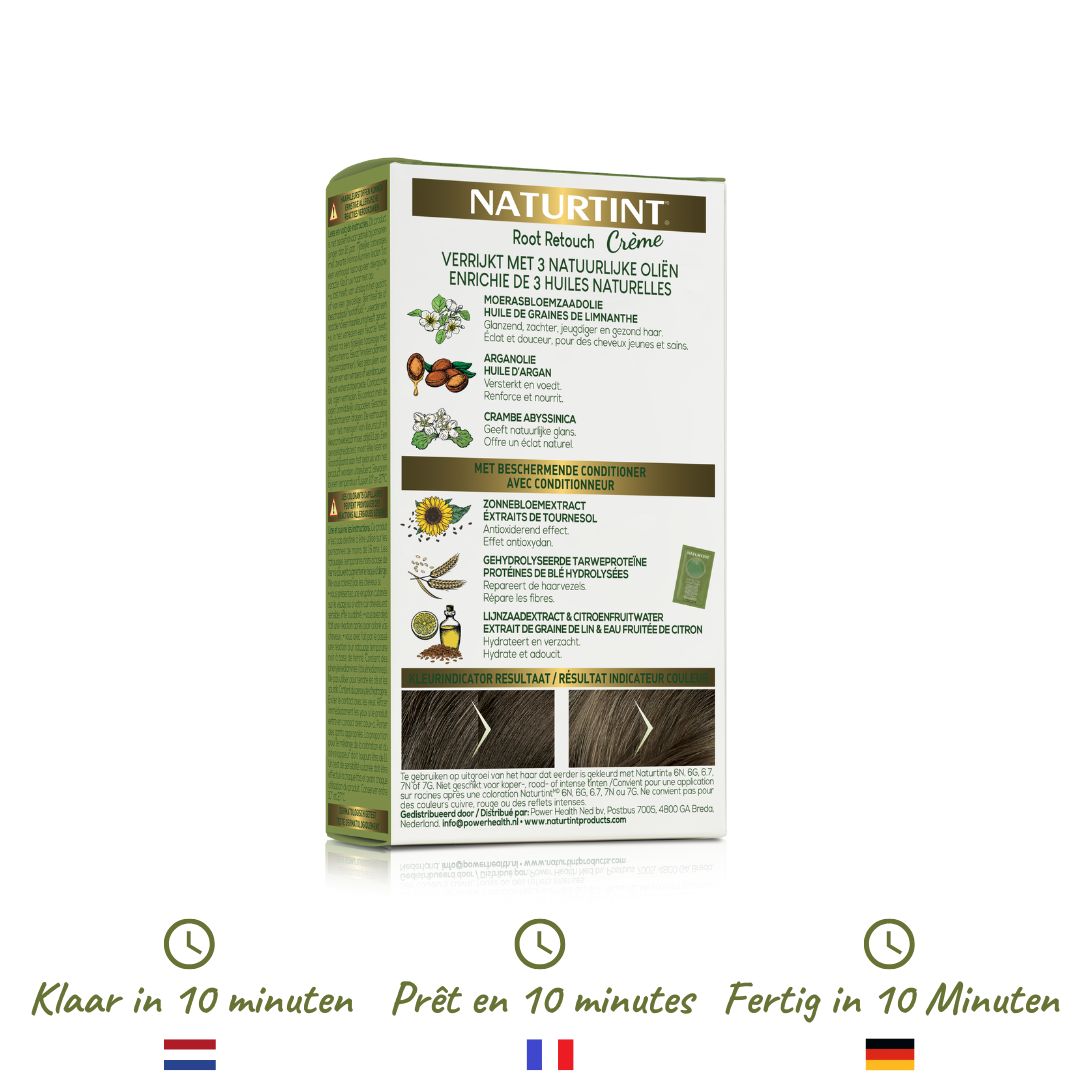 Zeg uw haaruitgroei gedag in slechts 10 minuten. Natuurlijk stralende kleur & glans. Geschikt voor donker blonde tinten. Te gebruiken op uitgroei van het haar dat eerder is gekleurd met bv. Naturtint® 6N, 6G, 6.7, 7N of 7G. Niet geschikt voor koper-, rood- of intense tinten.