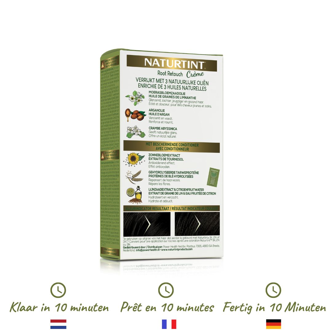 Zeg uw haaruitgroei gedag in slechts 10 minuten. Natuurlijk stralende kleur & glans. Geschikt voor donker bruine tinten. Te gebruiken op uitgroei van het haar dat eerder is gekleurd met bv. Naturtint® 1N, 2N of 3N.