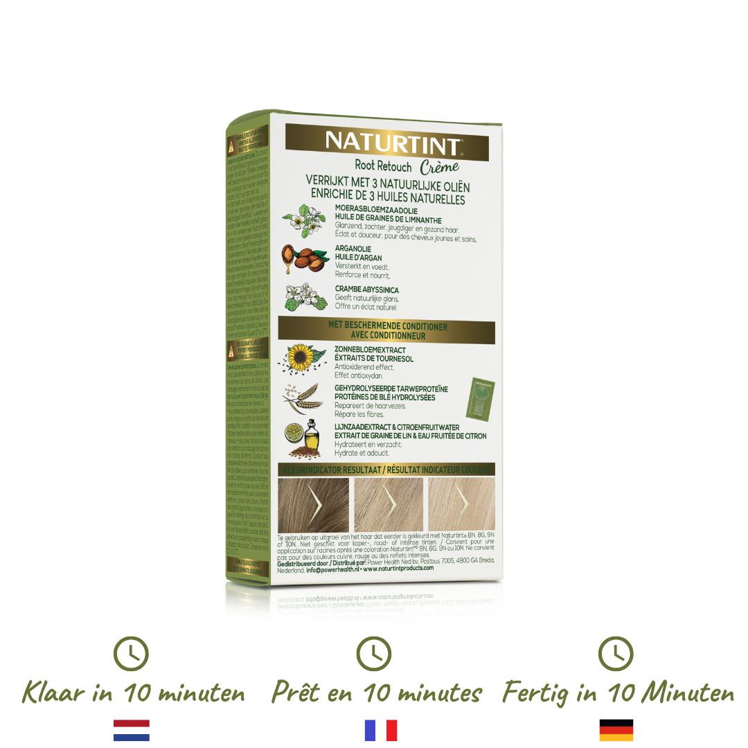Zeg uw haaruitgroei gedag in slechts 10 minuten. Natuurlijk stralende kleur & glans. Geschikt voor licht blonde tinten. Te gebruiken op uitgroei van het haar dat eerder is gekleurd met bv. Naturtint® 8N, 8G, 9N of 10N. Niet geschikt voor koper-, rood-, of intense tinten.